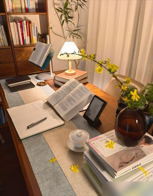 书架从地到顶,书堆得杂:艺术册旁边塞着推理小说,电影剧本底下压着菜谱——这才像“人住的书房”啊!难道书房就得摆得跟图书馆似的?我家书房的书也乱,昨天翻《人间失格》,今天看《家居收纳100招》,偶尔还夹着两张没写完的便签纸。费翔的吉他靠在墙角,我家的尤克里里挂在门后,心情好就弹两句跑调的曲子——这不是“乱”,是“日子该有的样子”:没章程,但有意思。